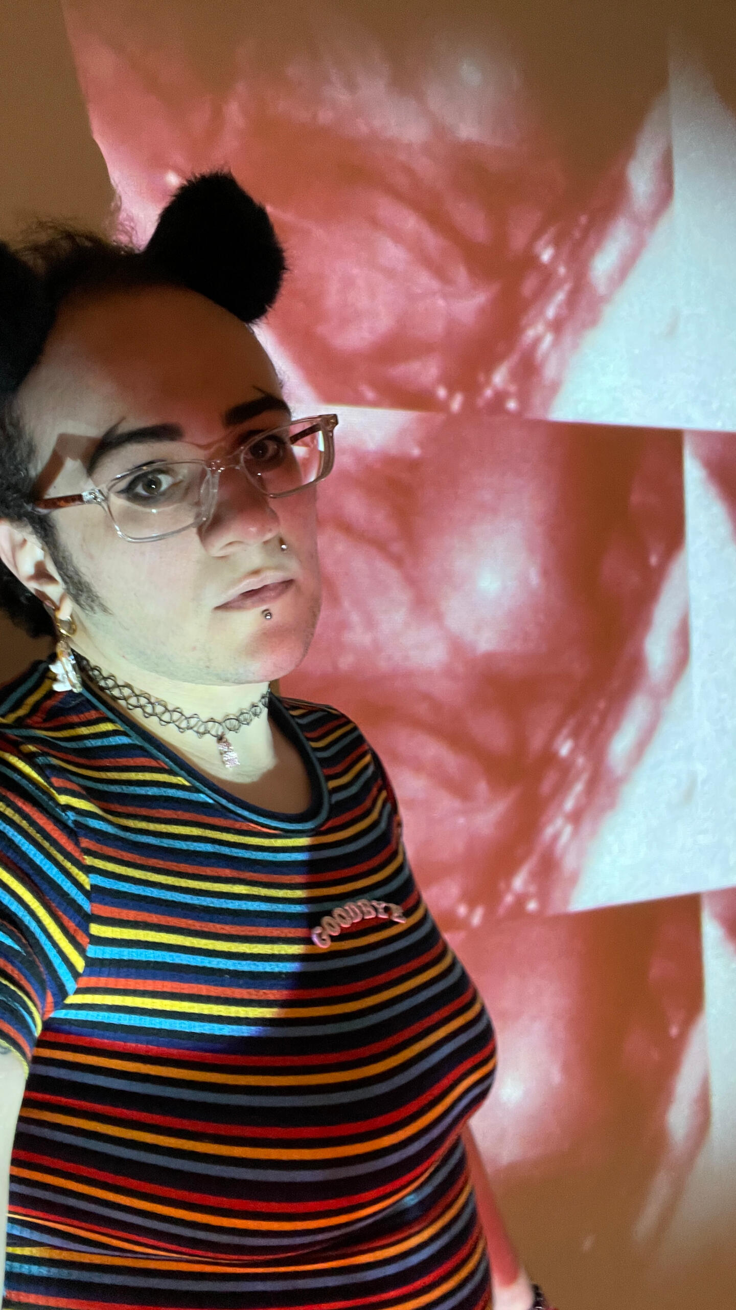 My work is eclectic, my processes are unconventional, and my journey is nontraditional. I am constantly shifting; moving house, recovering from illness, bending my gender, changing my names. Possessing an unstable body and identity leads to an attachment to tangible things outside of myself. I have an affection for discarded junk— my work employs an array of well-loved, texturally stimulating found objects that can be tacked, taped, or tied. Temporary security and delicate, precarious bindings allow my pieces to remain free. They can be undone and transplanted into a new environment, repeated or rearranged. My use of multiplicity, the aesthetics of maximalism, and strategies of symbolism reflect my high esteem for queer indulgence and trans resilience. My ephemera and craft materials are adorably cheap and vulnerable. I take the mundane and the painful, and twist them, reinvent them, until they become reflections of an ideal, bewitching being.These conceptual and technical habits are anomalous, experimental, and deviant. My background is mostly self-taught, with formal art education being a luxury I have only recently been able to pursue. As such, my practice is a patchwork collection of mediums, disciplines, concepts, and inspirations. I am as inspired by romantic poetry and Northern Renaissance art as I am by low-budget horror films, drag performers, and DIY websites from the early 2000s. Anything that has a cult following is worth learning from.While I began using affordable materials solely out of necessity, I have committed to using these same materials with purpose. Every choice I make to adorn a discounted canvas with gel pens is an act of resisting the binary of “high” and “low” art. Repurposed pill bottles allow me to explore concepts of mental illness while being less wasteful when it comes to the items that keep me healthy. I give discarded stuffed animals new life in my installations. I am obsessed with my outdated iPhone, which I use to warp myself into a work of art with a snap of the selfie camera and the help of a few apps. I proliferate my ideas with copy paper and nontoxic craft glue. I balk at societal standards of beauty; my odd, tacky, and rejected components are proudly elevated into the gallery space as a new prompt for creative conversation.I present raw investigations of my body, my identity, and my place in the world in hopes of sparking similar curiosities in others. I staple Valentine hearts onto everything to remind myself and others to be passionate and indulgent with their love, even if that love is nothing but a fabricated performance. With this work, I invite viewers to sensually explore these private and confusing parts of the self within and outside of its surroundings. As an act of radical queerness, I welcome others to violate boundaries with me, to subvert what we think we know, and to revel in both the pain and the joy that comes from instability.
